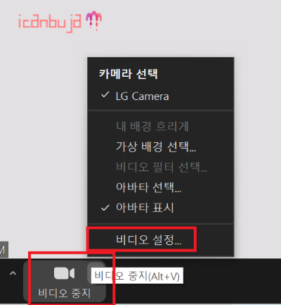1. zoom화면 하단 비디오 선택 화살표 들어가면 위와 같이 비디오 설정목록이 나온다.